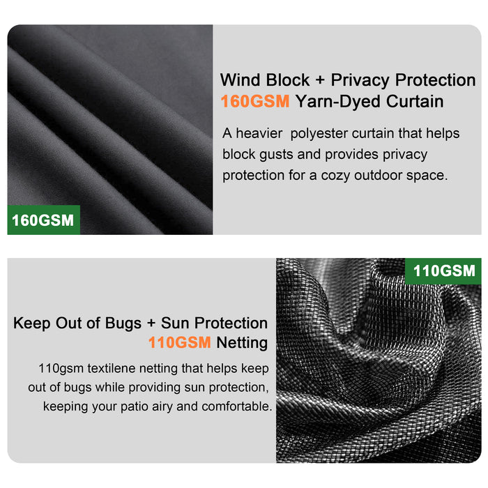 Double Slide Track System: Easy-to-use zippered curtains and netting for privacy and ventilation.